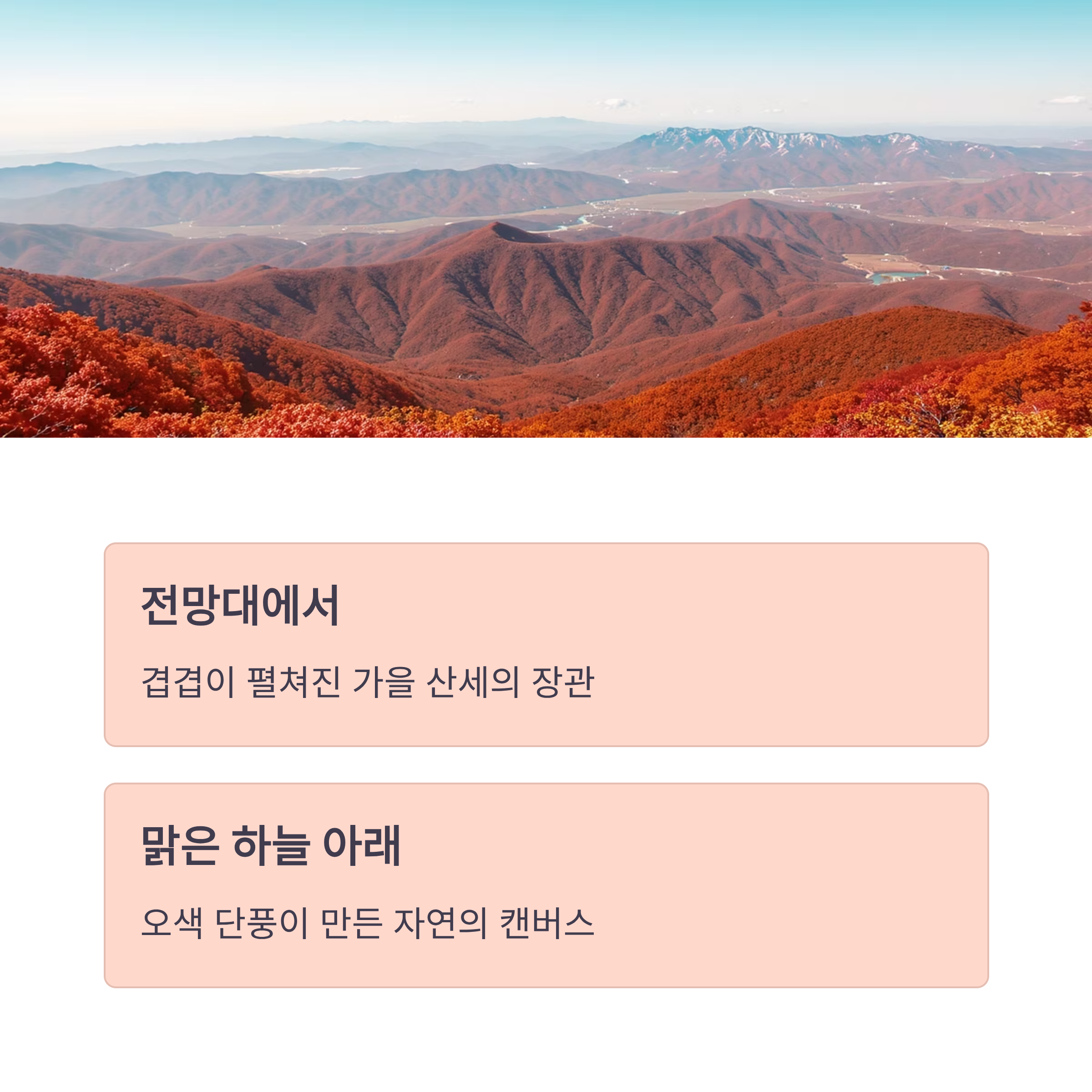 - 왕자봉 정상: 드디어 정상! 가슴이 뻥 뚫리는 시원한 조망을 만끽하세요. 파노라마처럼 펼쳐지는 단풍 숲이 정말 장관이에요.