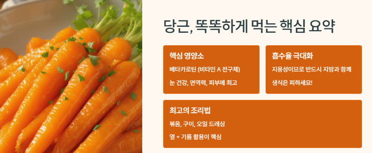 자, 오늘 당근에 대한 모든 것을 알아봤는데요, 핵심만 다시 한 번 짚어볼게요. 이 내용만 기억하셔도 당근 섭취 마스터가 되신 거예요.
