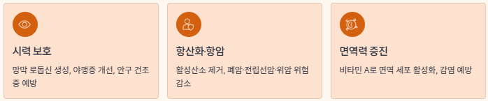 - 시력 보호 및 야맹증 개선: 베타카로틴은 망막의 로돕신 생성을 도와 밤에 사물을 더 잘 보게 해주고, 안구 건조증 같은 질환을 예방하는 데 결정적인 역할을 해요.