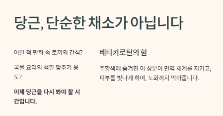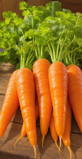 - 효능: 당근은 비타민 A 공급원으로서 시력, 면역력, 항암 작용에 매우 뛰어납니다. 피부 건강에도 필수적이죠.