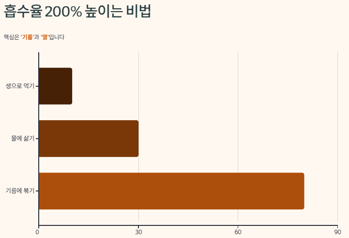 | 기름에 볶거나 튀기기 | 80% 이상 | 가장 효율적인 섭취 방법! |