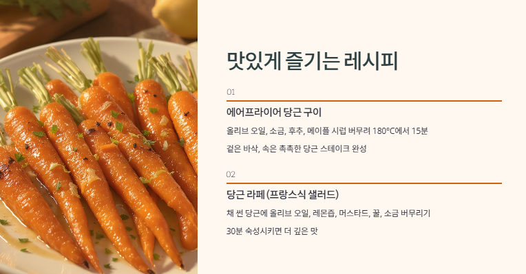 이제 당근이 건강에 얼마나 좋은지, 어떻게 먹어야 좋은지 알았으니, 일상에서 쉽게 실천할 수 있는 꿀맛 레시피를 공유해 드릴게요! 제가 실제로 자주 해 먹는 방법들입니다.