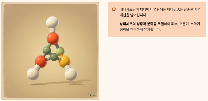 베타카로틴이 몸속에서 바뀌는 비타민 A는 단순한 시력 개선을 넘어, 상피세포의 성장과 분화를 조절하는 핵심 영양소예요. 피부, 호흡기, 소화기의 점막을 건강하게 유지하여 외부 병원균의 침입을 막아줍니다.