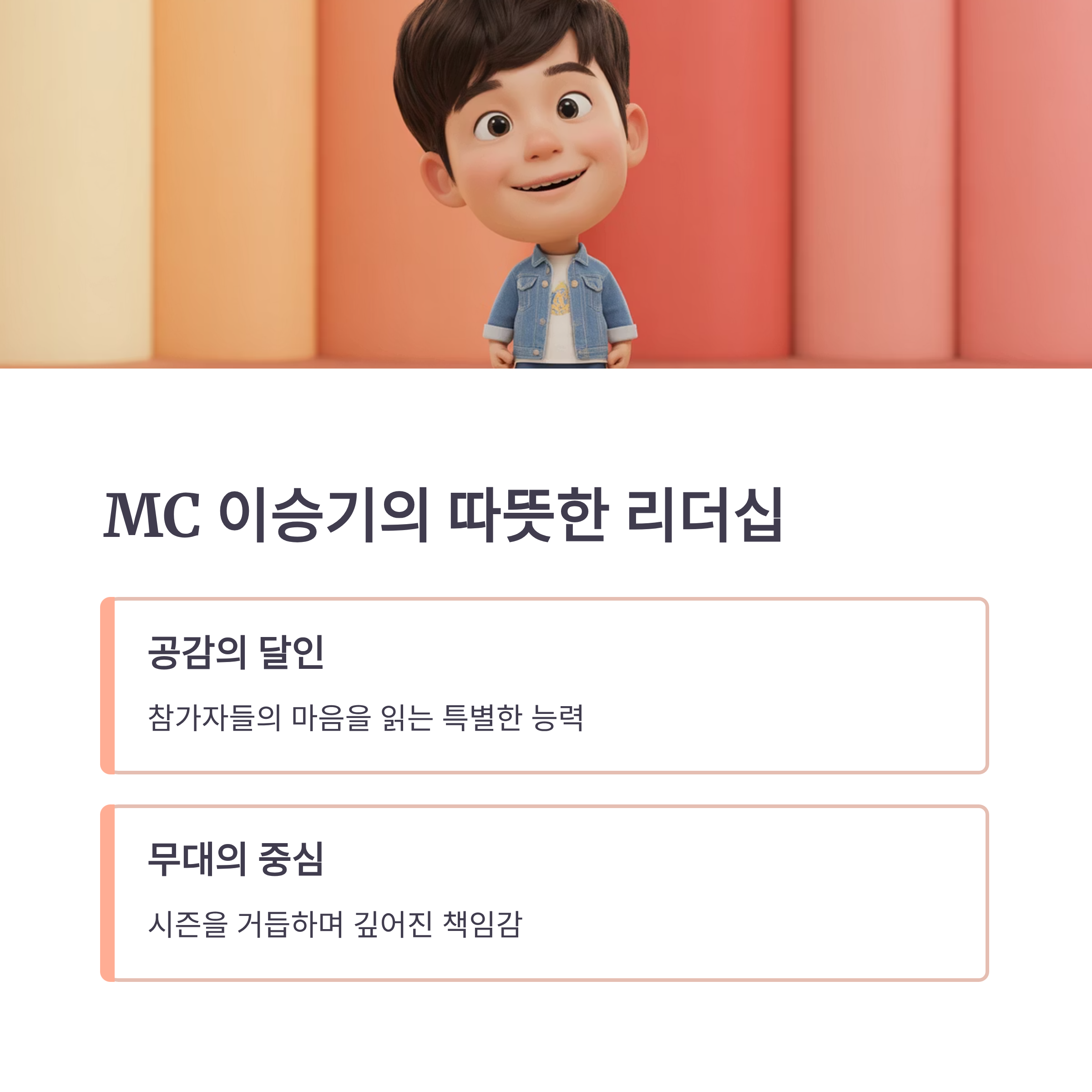 그의 안정적인 진행과 참가자들을 향한 진심이 시청자들에게 편안함과 신뢰를 주기 때문에, 이 프로그램의 장수에는 MC 이승기의 역할이 절대적이라고 할 수 있습니다.