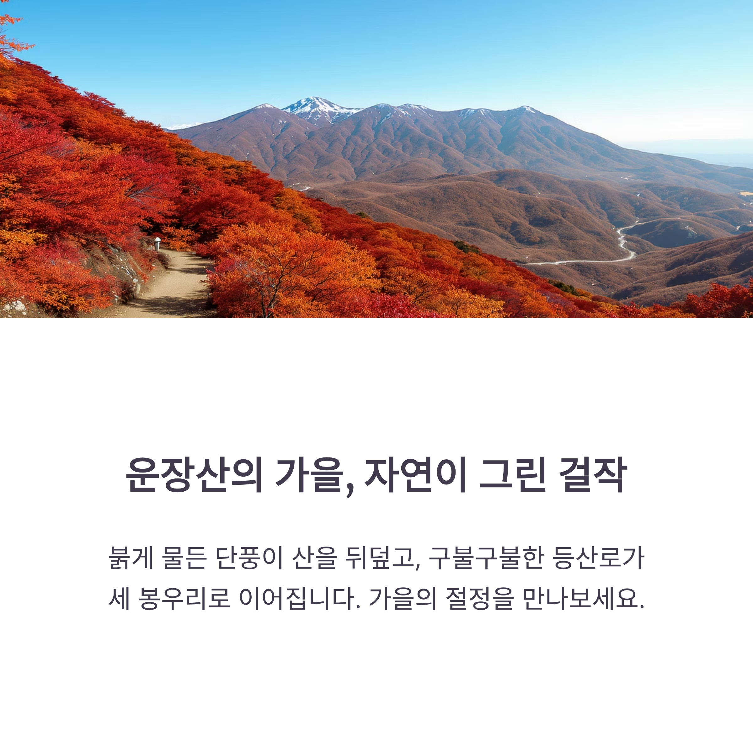 - 가을: 10월 중순에서 말경, 운장산은 울긋불긋 단풍으로 물들어 절정을 이룹니다. 봉우리마다 다른 색깔의 옷을 입은 듯한 모습이 정말 환상적이에요. 인생 사진을 남기기에도 더없이 좋은 시기죠!