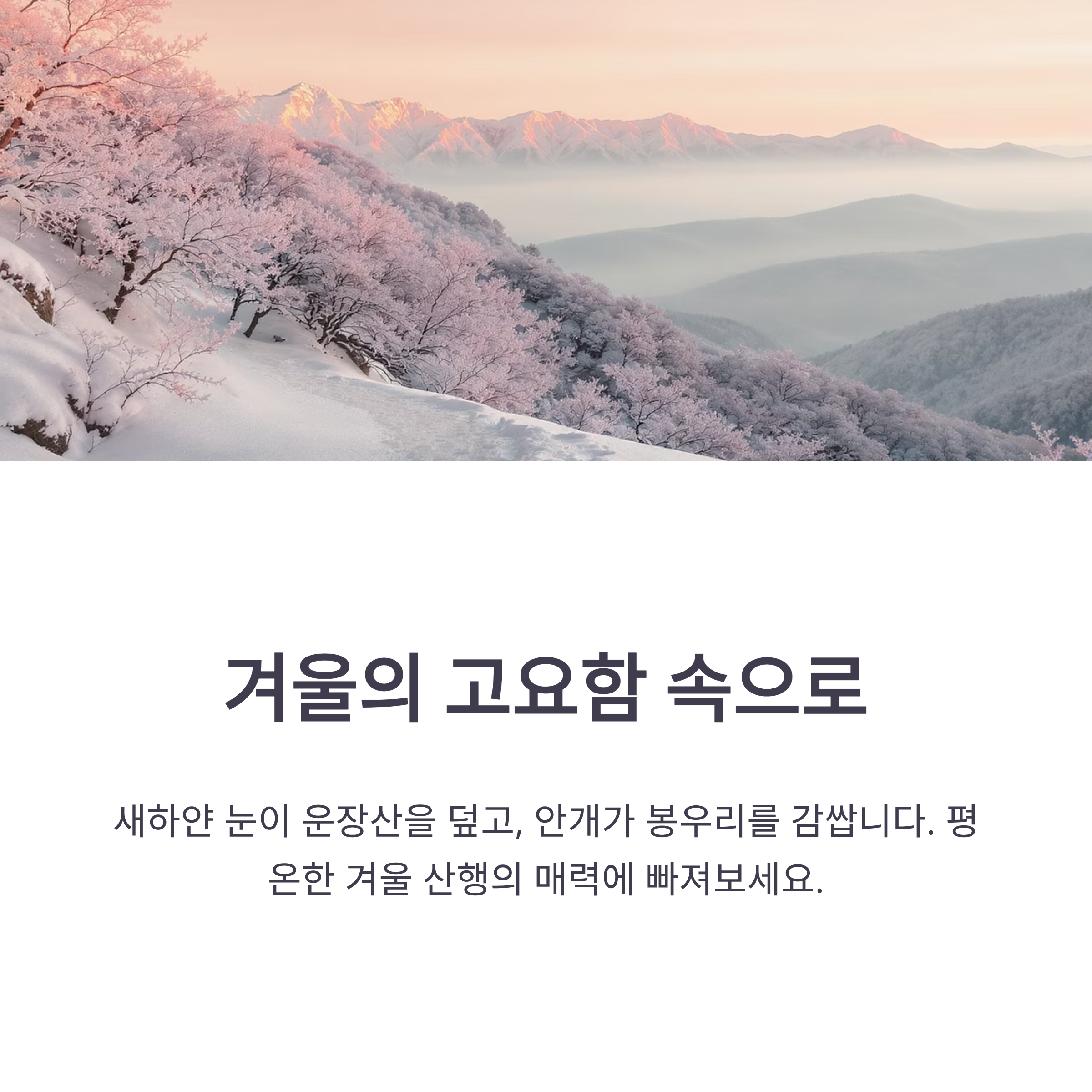 - 겨울: 눈이 내리면 운장산은 은빛 세상으로 변모합니다. 눈꽃이 활짝 핀 나뭇가지들과 설경이 어우러진 풍경은 마치 한 폭의 동양화를 보는 것 같아요. 겨울 등산은 준비물이 더 많지만, 그만큼 감동도 두 배로 다가올 거예요.