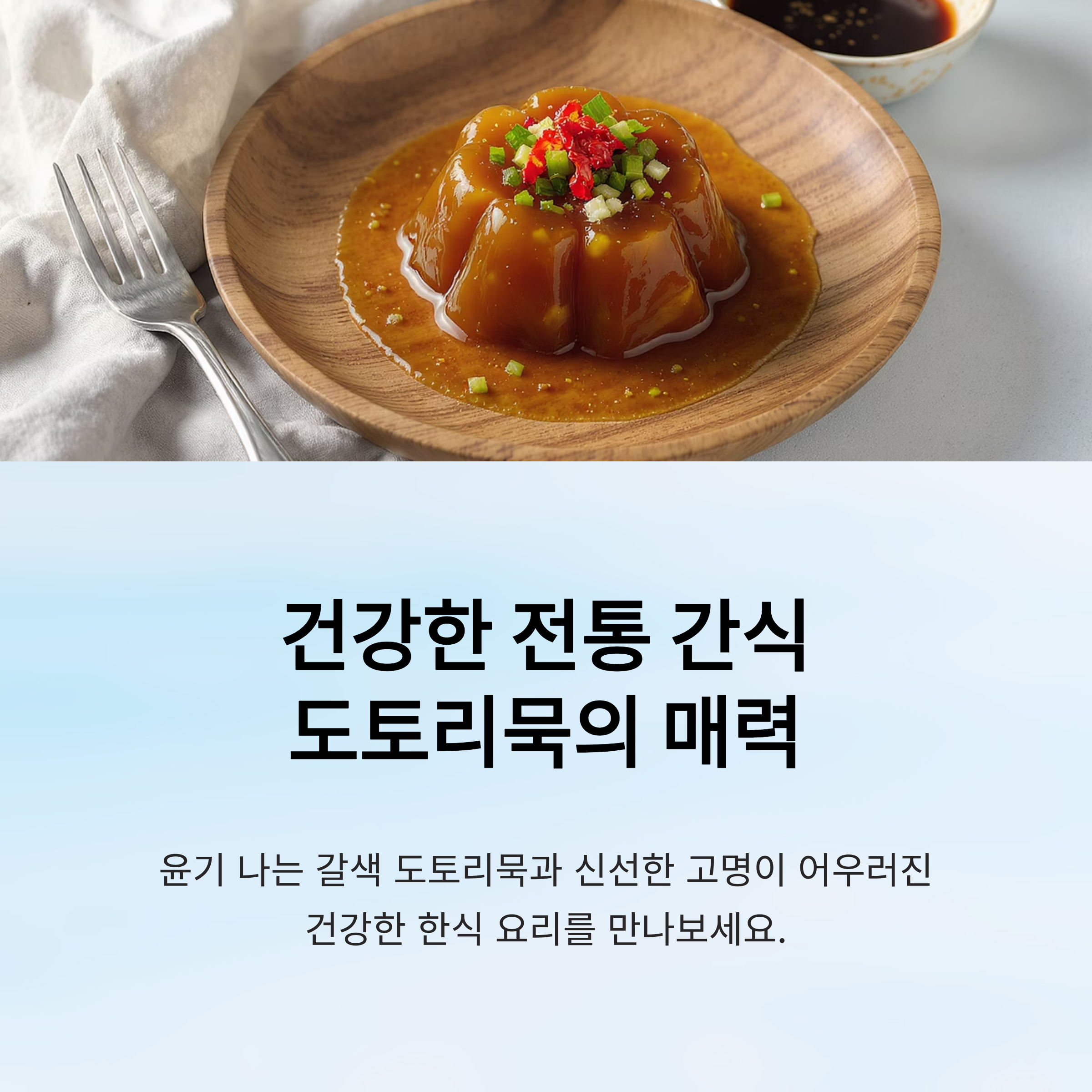 지금까지 탱글탱글하고 쫀득한 도토리묵을 만드는 모든 비법을 알려드렸습니다. 이제 비율 걱정, 굳는 걱정 없이 자신 있게 도토리묵을 쑤어보세요. 산뜻한 양념장과 함께라면 밥도둑이 따로 없을 거예요! 즐거운 요리 되세요! 😊