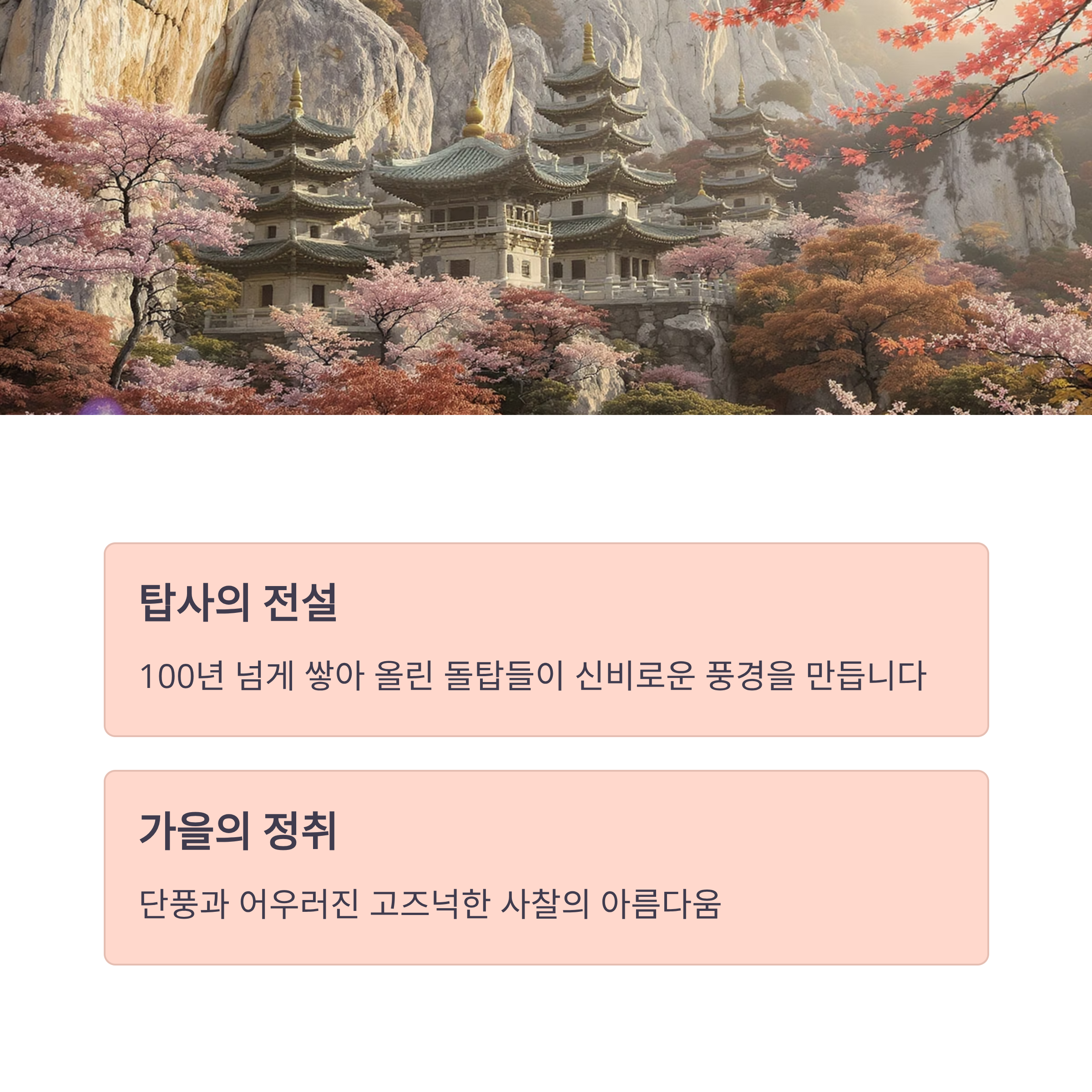 이 코스는 거의 평탄한 길로 이루어져 있어서 남녀노소 누구나 편안하게 걸을 수 있어요. 가는 길에 금당사와 은수사도 만날 수 있어서 잠시 쉬어가며 고즈넉한 사찰의 분위기를 느껴보는 것도 좋답니다. 특히 탑사에 도착하면 수많은 돌탑들이 병풍처럼 펼쳐져 있는데, 정말 신비롭고 이국적인 느낌을 줘요. 사진 찍기에도 정말 최고랍니다! 📸