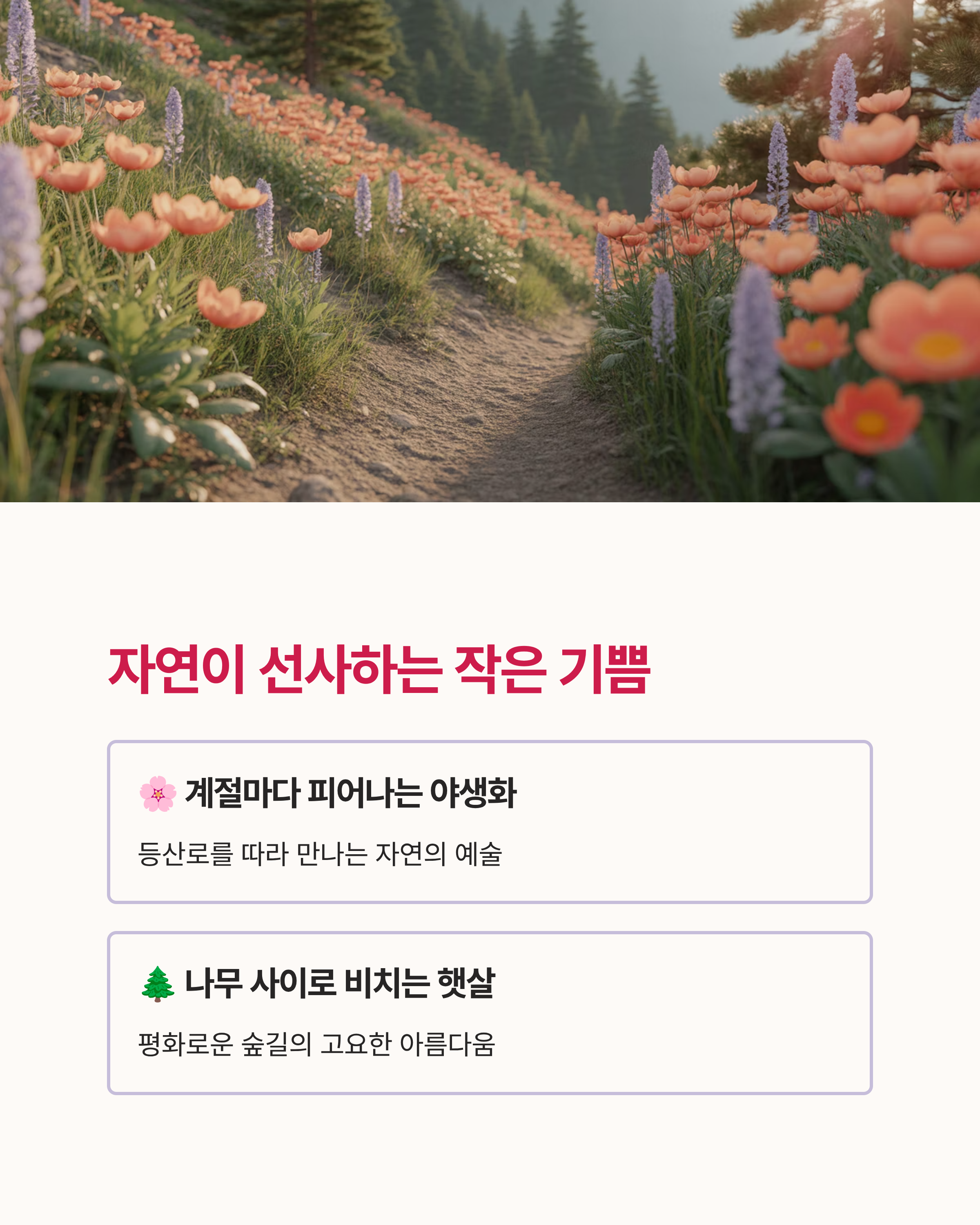 - 안전 등산 팁: 등산화와 기능성 복장은 필수! 무리하지 않는 것이 가장 중요하며, 쓰레기 되가져오기 등 자연 보호에도 힘써주세요.