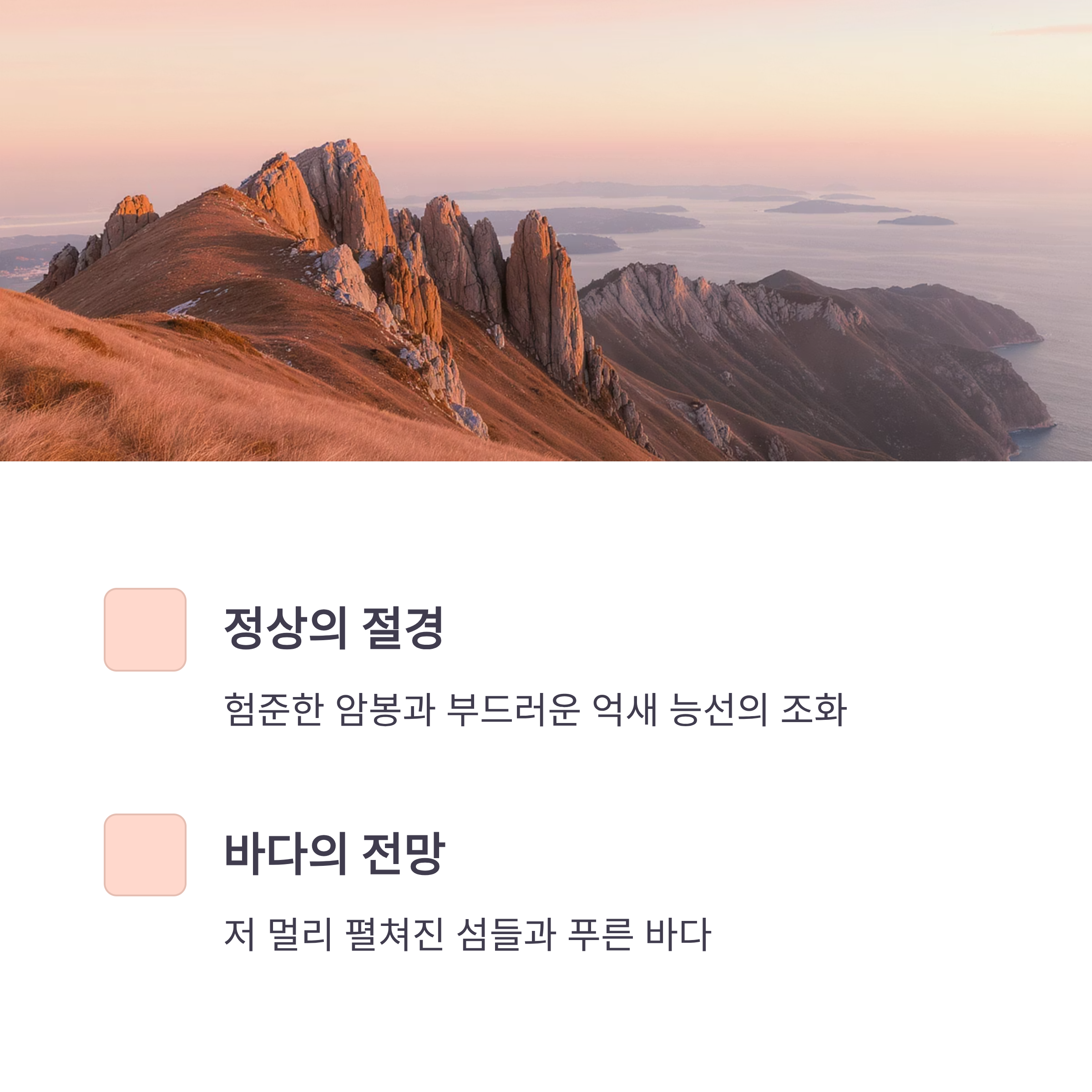 - 정상(연대봉)까지: 억새밭을 지나 정상까지 가는 길은 더욱 환상적입니다. 다도해를 배경으로 펼쳐진 억새는 정말 예술이에요!