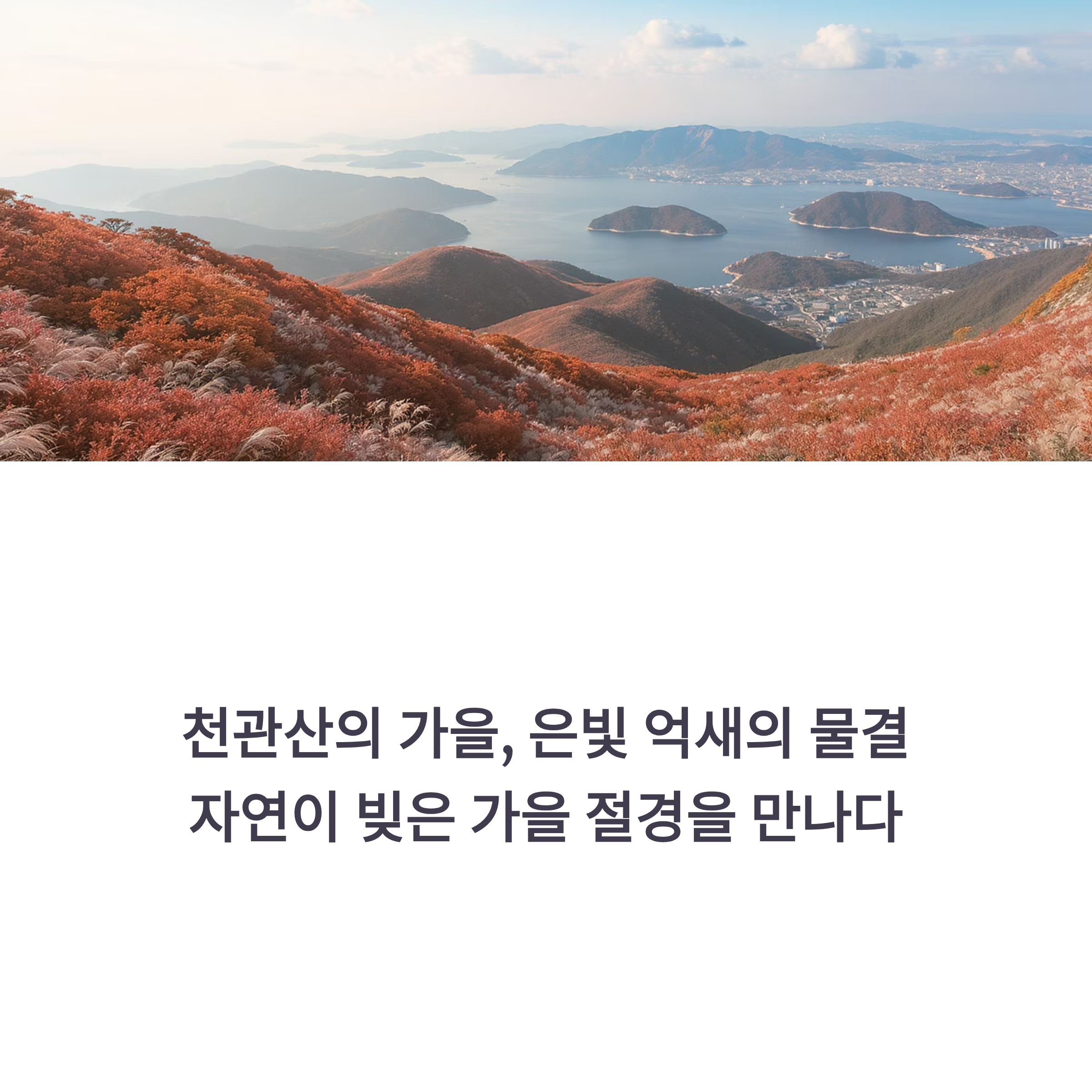 천관산을 이야기하면서 억새를 빼놓을 수 없죠! 가을이 되면 정상부 일대가 온통 은빛 억새로 뒤덮여 환상적인 풍경을 연출한답니다. 바람에 일렁이는 억새 물결은 그야말로 장관이에요.