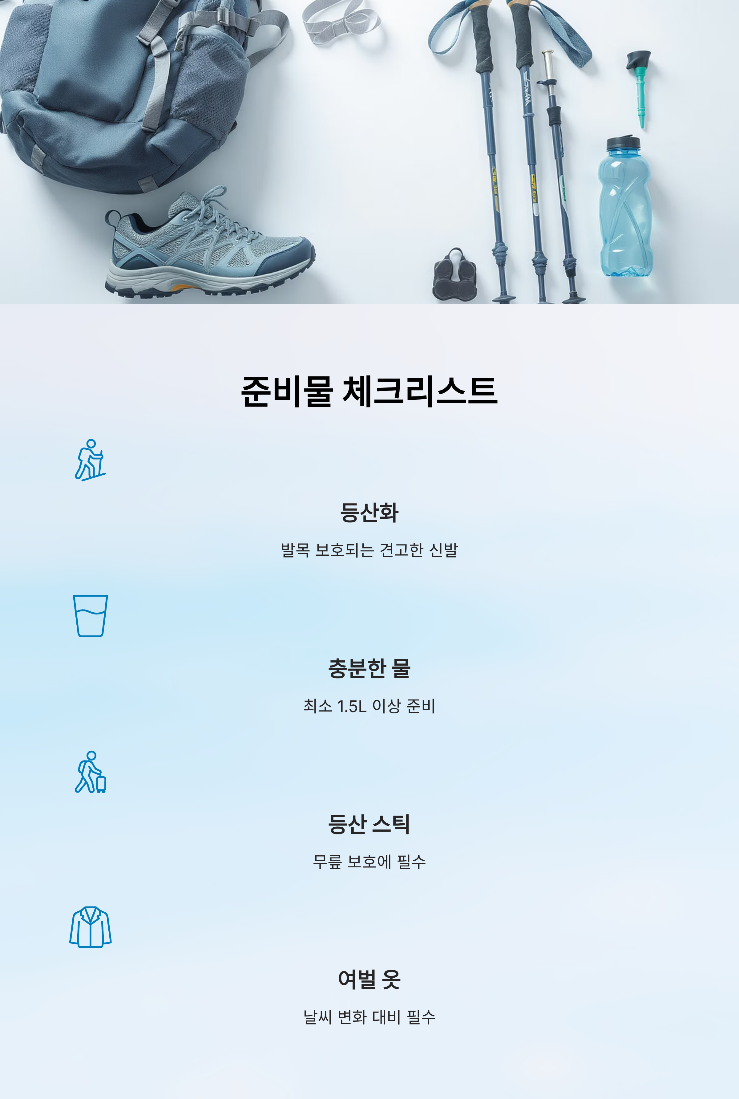 - 등산 스틱: 체력 소모를 덜어주고 균형 유지에 도움을 줍니다.