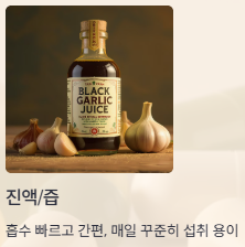- 흑마늘 진액/즙: 간편하게 마실 수 있어 꾸준히 섭취하기 좋음. 장점: 흡수가 빠르고 섭취 용이. 단점: 첨가물(당분) 포함 여부 확인 필수.
