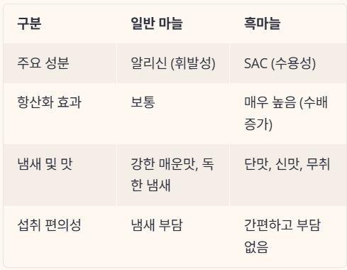 | 구분 | 일반 마늘 | 흑마늘 (발효/숙성 후) |