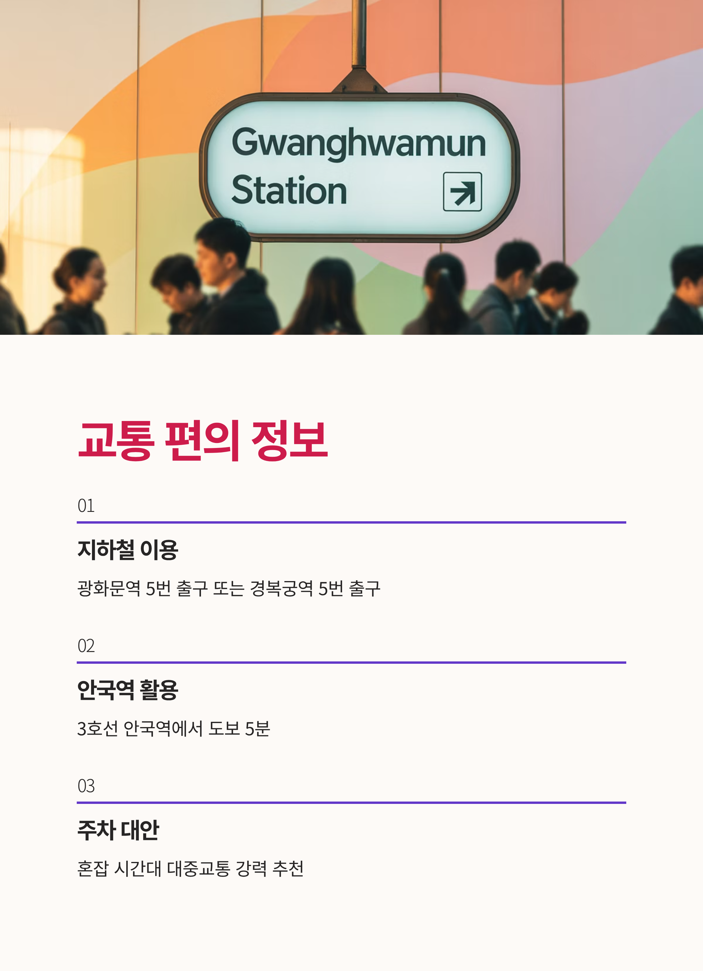 - 지하철: 3호선 안국역 (1번 출구), 5호선 광화문역 (2번 출구)에서 도보 이동