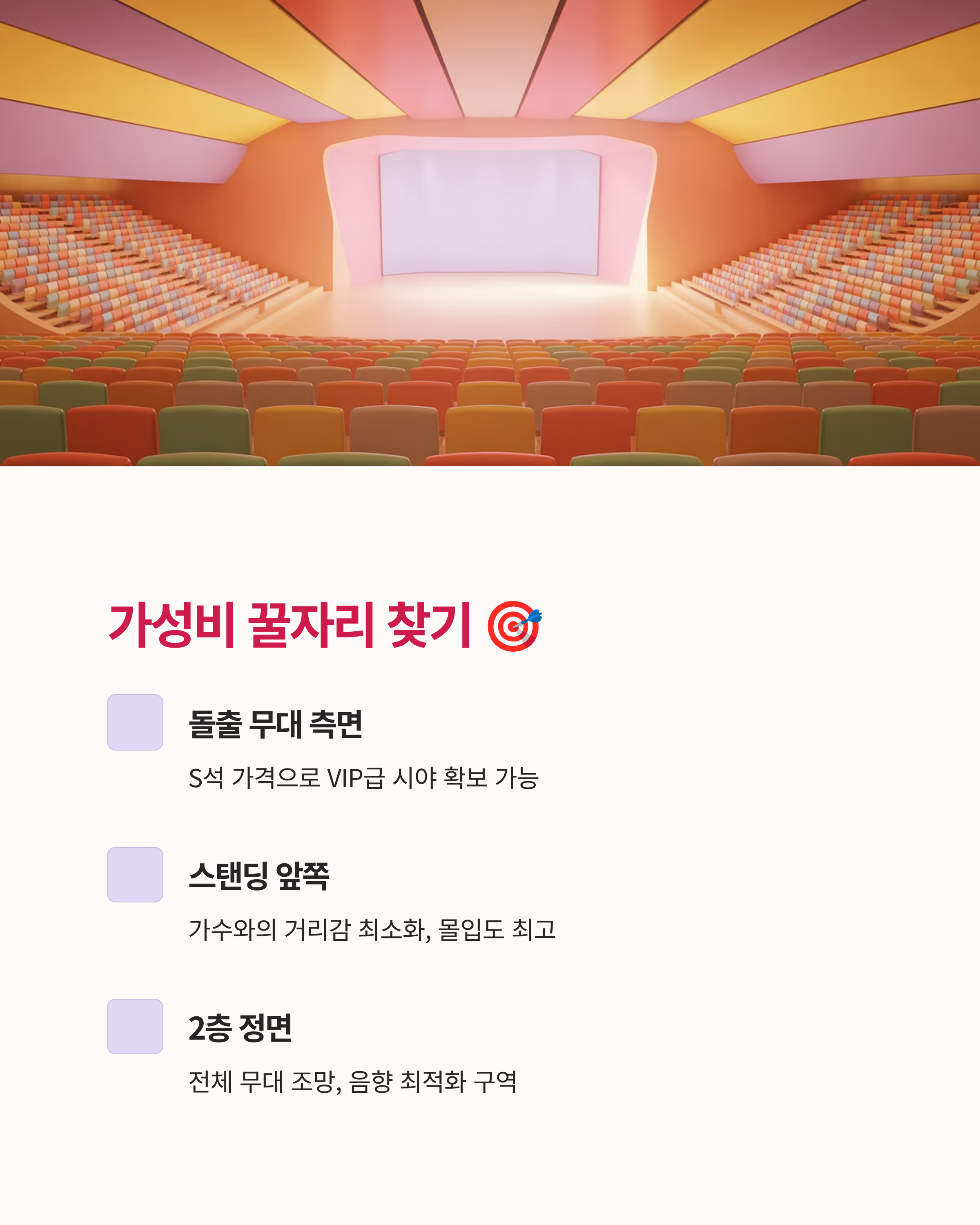 다만, 무대 전체 구성을 보려면 2층 중앙 블록 앞쪽이 좋다는 점도 기억해두세요.